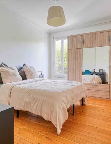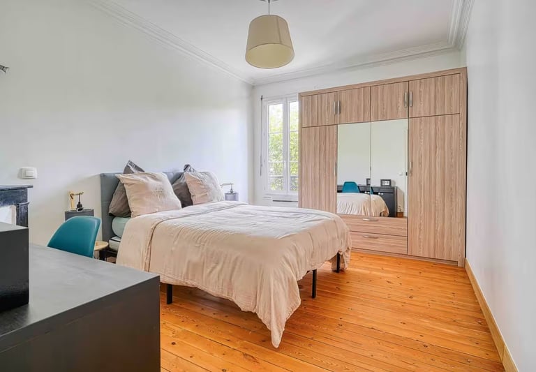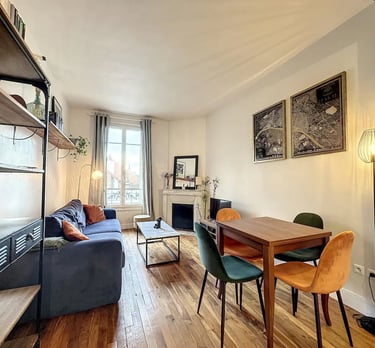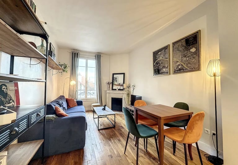 Appartement haussmannien de 42 m² alliant charme et confort moderne : parquet, moulures, cuisine équipée, salon cosy, chambre double, douche à l’italienne, calme, proche RER A et nature.